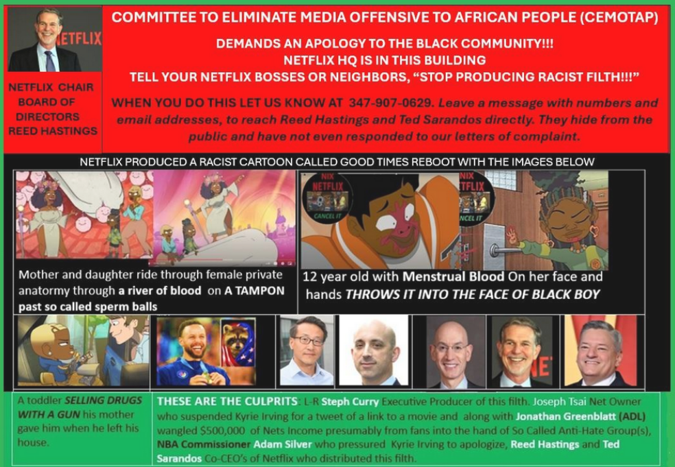 CEMOTAP FOUNDER Betty Dopson says that all over the internet is Netflix propaganda acknowledging that public pressure caused the cancellation of the vile, violent and racist cartoon series Good Times Black Again distributed by Netflix.