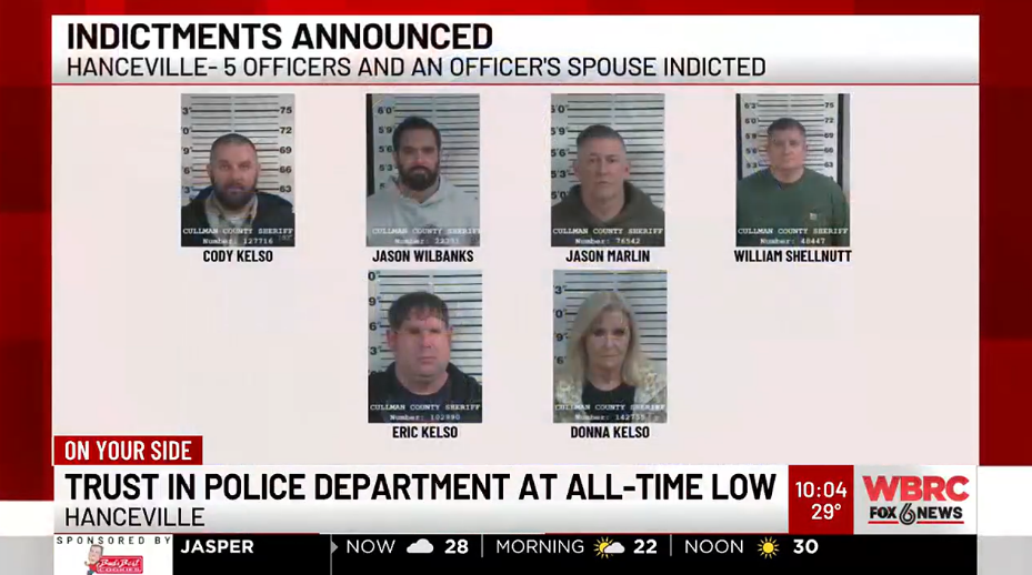 Five Hanceville police officers were arrested and charged amid a probe into the department, Cullman County District Attorney Champ Crocker said. The spouse of one of the officers was also charged, he said.