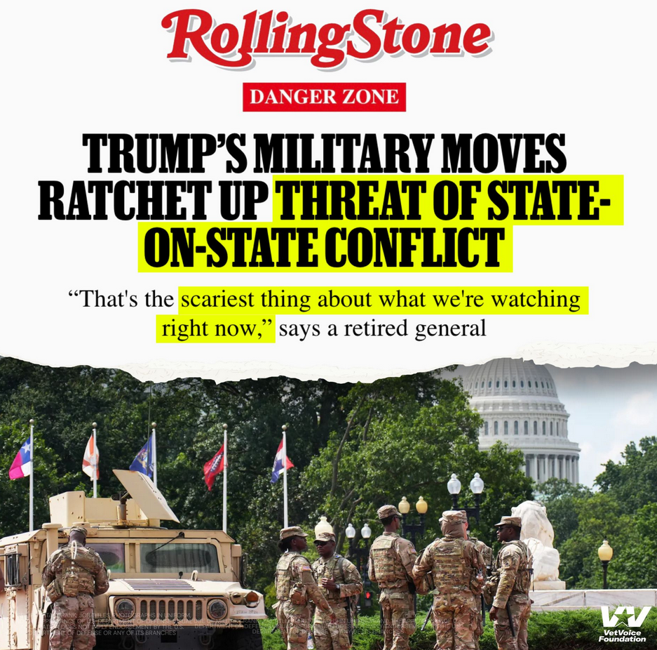 “The federalization of the California National Guard and deployment of federal forces to Los Angeles against the will of state and local authorities should give any supporter of the military and military members pause,” said Janessa Goldbeck, CEO of Vet Voice Foundation. “It’s a politicization of the armed forces. Using our military as political pawns strains their apolitical reputation. National Guard members should not be acting as civilian law enforcement by patrolling our streets.”
