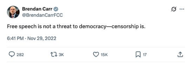 In November 2022, Carr noted that “Free speech is not a threat to democracy—censorship is.”