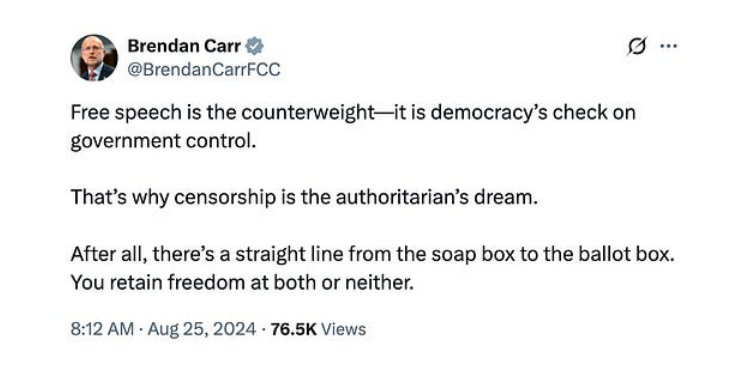 (In August 2024, Carr echoed the same phrase, adding that “there’s a straight line from the soap box to the ballot box. You retain freedom at both or neither.”)
