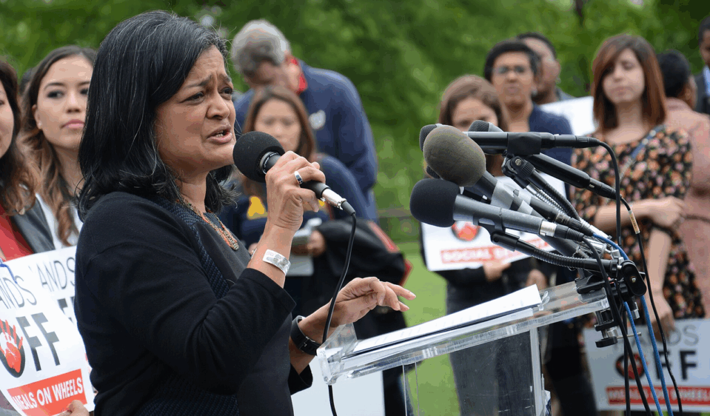 “You have an authoritarian president and a Congress hell-bent on giving up its power. The solution is left to the American people,” Jayapal said. “I call it getting strike-ready and getting street-ready.”
